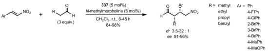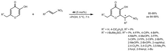 Preliminary experiments allowed establishing that 44 gave better results compared to the three other organocatalysts. In isopropanol as the solvent, the catalyst 44 (5 mol%) led, after 7 h at 5 °C, to the (R)-configured adducts in excellent yield (85–99%) and enantioselectivity (85–99% ee) starting from a variety of nitrostyrenes and even a n-butyl derivative (Scheme 12).