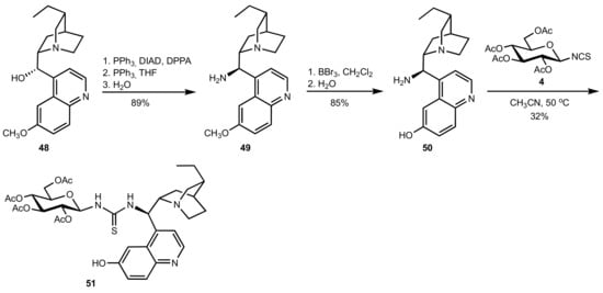 The glucosyl thiourea organocatalyst 51 containing a cinchona alkaloid unit (Scheme 13) was also tested in the Michael reaction of pentane-2,4-dione to β-nitrostyrene [33]. The addition product was obtained in 40–42% yield and 59–64% ee, depending on the solvent used.