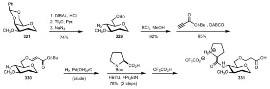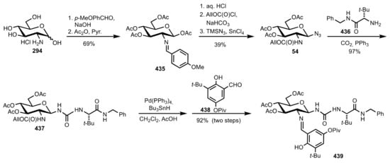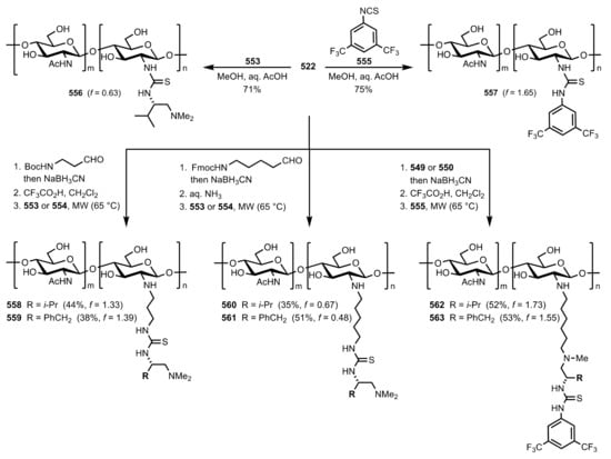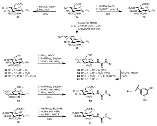 The allyloxycarbonyl group of the resulting urea derivatives was removed with palladium(0)-tetrakis(triphenylphosphine) and tributyltin hydride to give the free amine group that was dimethylated by reductive amination to afford 58–60. Standard deacetylation by transesterification of 58 led to the triol urea derivative 61. In order to prepare the tri-O-methyl-sugar urea organocatalyst, the glycosyl azide 55 was first N,N-dimethylated and then converted into the anomeric urea derivative 62. One thiourea organocatalyst was also prepared from 56; however, partial epimerization of the transient amine occurred, and therefore 63 was obtained as a mixture of anomers.