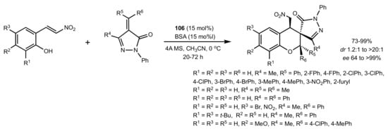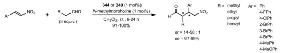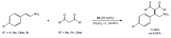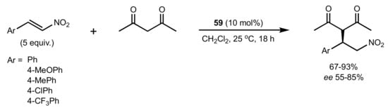 Application of the obtained derivatives in a reaction between acetylacetone and trans-β-nitrostyrene revealed persilylated catalyst 59 as the best candidate to optimization procedure; it was found that the chemical yield could be improved by the application of an excess of nitrostyrene (5 equiv.) and dichloromethane as solvent. Five different nitroolefins gave the corresponding adducts in good yield (up to 93%) and enantiomeric excess (up to 85%) (Scheme 15).