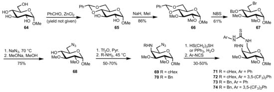 Another class of bifunctional organocatalysts in which H-bond donor and Lewis base functionalities were combined in a one chiral molecular scaffold were tested in the Michael addition of acetylacetone to β-nitrostyrene [46]. The synthesis of 4-amino-6-thioureidosugar organocatalysts 71–74 (Scheme 16) started from the bromide derivative 67, easily prepared from commercial methyl α-d-glucopyranoside as described [47].