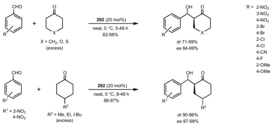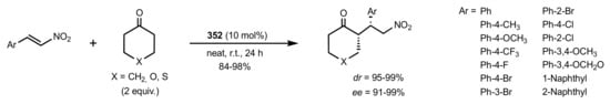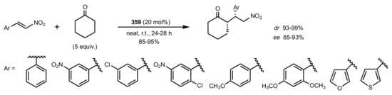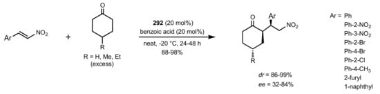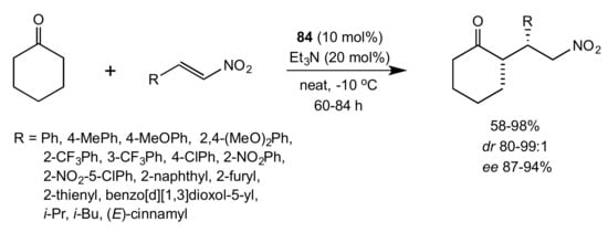 The Michael addition of cyclohexanone to aryl or alkyl nitroalkenes was performed with 10 mol% of the catalyst that gave the best preliminary results, i.e., 84, and 20 mol% of triethylamine in the absence of solvent at −10 °C, for at least 60 h. The conversion of various trans-β-nitrostyrenes was generally high (85–98% yield), but for aliphatic substrates yield dropped down to ca. 60% (Scheme 18). Stereoselectivity was in most cases excellent (up to 99:1 dr and 95% ee). Cyclohexanone could be also replaced with other Michael donors, e.g., ketones and esters bearing electron-withdrawing groups. The outcome was supported by density functional theory (DFT) calculations, and the role of cyclohexanone serving both as solvent and reactant in the key step was shown.