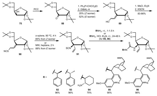In 2020, the novel catalysts 92–96 (Scheme 19) based on a glucofuranose skeleton bearing a thiourea group at C-3 and various chiral amines were reported by Tvrdoňová and co-workers [49]. Their preparation made use of isothiocyanate 91, which was synthesised as previously reported by them [50] starting from either E or Z isomer of allylic alcohol 89 (separated by column chromatography). The latter was obtained by oxidation (yield not given) of 75 with pyridinium chlorochromate (PCC) followed by Wittig olefination with [(ethoxycarbonyl)-methylene]triphenylphosphorane, and subsequent reduction with DIBAL-H as described [51,52,53]. The alcohol 89 was mesylated and reacted with potassium thiocyanate to give 90 that was submitted to thermal [3,3]-sigmatropic rearrangement to afford the isothiocyanate derivative 91. Reaction of the latter with various primary amines led to 92–96.