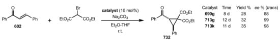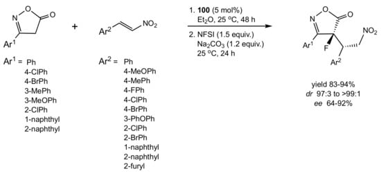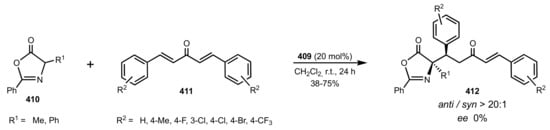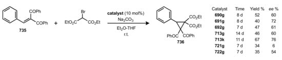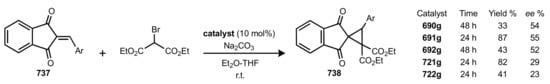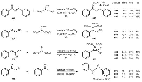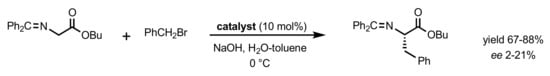 - For a review, see: Ooi, T.; Maruoka, K. Recent advances in asymmetric phase-transfer catalysis. Angew. Chem. Int. Ed. 2007, 46, 4222–4266. [Google Scholar] [CrossRef]