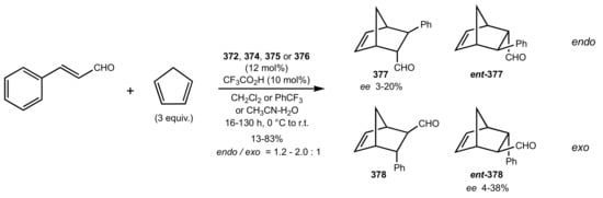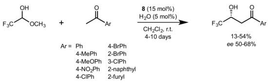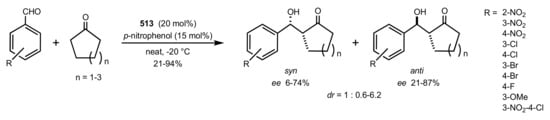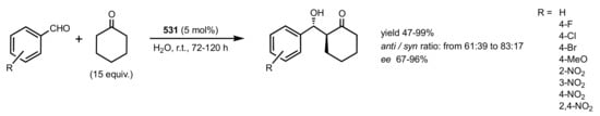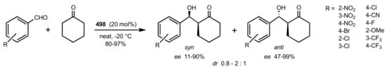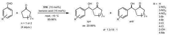 The matching of l-configured valine and d-sugar resulted in enantiomeric excess enhancing (up to 91%). Moreover, the aminoacid fragment was found to determine the stereochemical outcome of the process (Scheme 11). What is worth underlining, the use of “mismatched” organocatalysts and changing toluene to THF solvent gave the opposite enantiomeric adduct with the same ee.