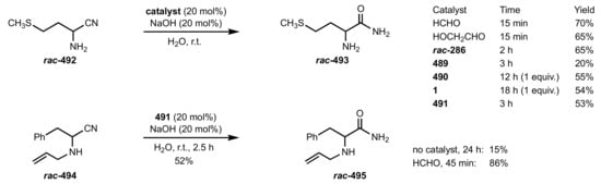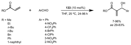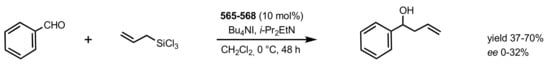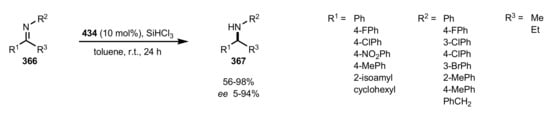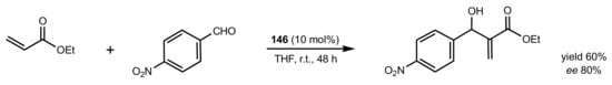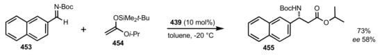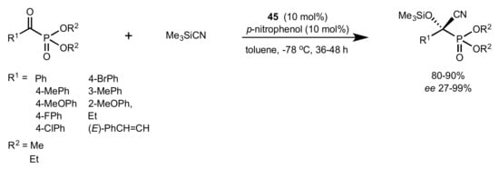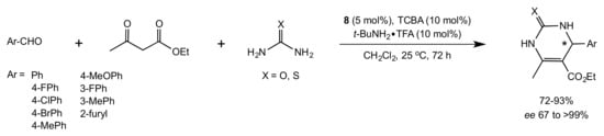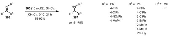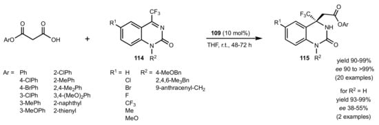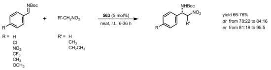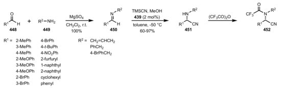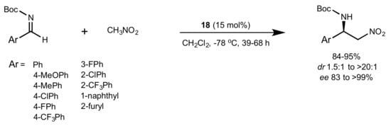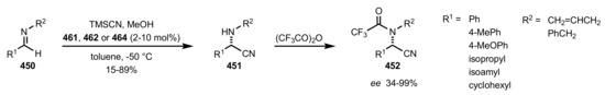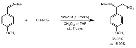 In their pioneering work, Jacobsen and co-workers showed that chiral urea or thiourea catalysts containing Schiff base can be used in asymmetric cyanation reaction of aldimines and ketimines [26,27]. A variety of bifunctional catalysts based on thioureas of chiral diamines have been developed by several groups, e.g., those led by Takemoto [28] and Nagasawa [29]. These organocatalysts are able to catalyse Michael, Mannich, aza-Henry, Morita–Baylis–Hillman, Strecker and many other reactions, thus, providing a variety of useful chiral building blocks.
