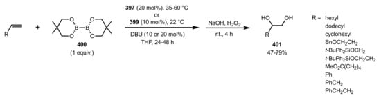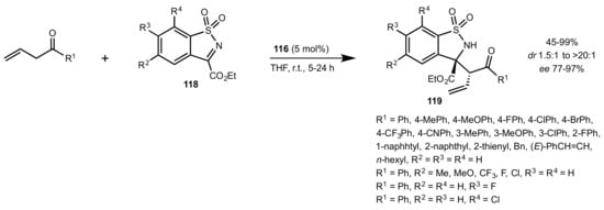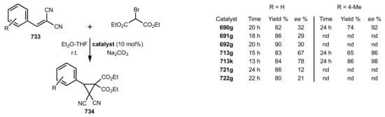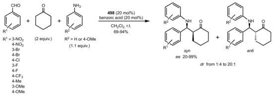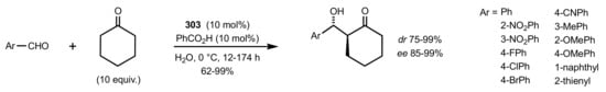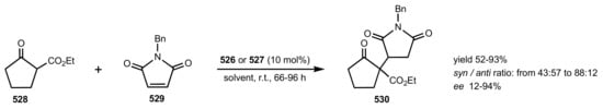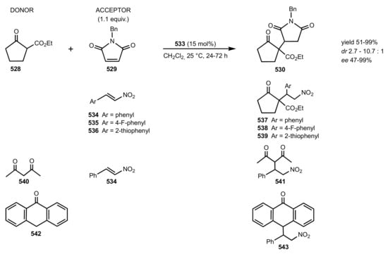 In order to address the above-mentioned issues, organocatalysis has been widely exploited since the beginning of the present century [2,3,4], and its profound impact on the asymmetric synthesis has been emphasized by the Nobel prize in Chemistry 2021, which has been awarded jointly to B. List and D. W. C. MacMillan. During the last twenty years, a considerable number of organocatalysed reactions have been developed, most of them performed in the presence of proline derivatives or cinchona alkaloids.
