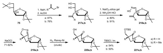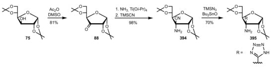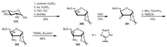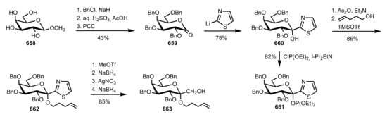 - For a review on the use of thiazole in carbohydrate chemistry, see: Dondoni, A.; Marra, A. Thiazole-mediated synthetic methodology. Chem. Rev. 2004, 104, 2557–2599. [Google Scholar] [CrossRef]