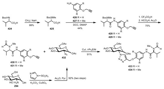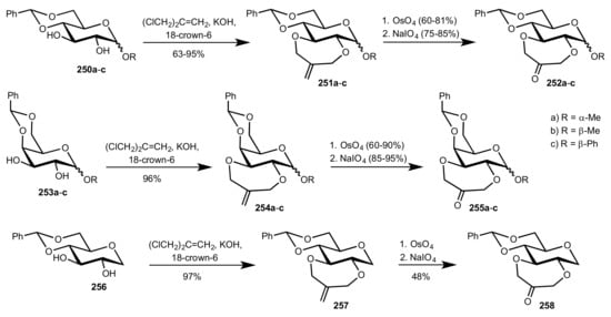 - Dondoni, A.; Marra, A. Transformation of linear oligoketosides into macrocyclic neoglycoconjugates. Tetrahedron Lett. 2009, 50, 3593–3596. [Google Scholar] [CrossRef]