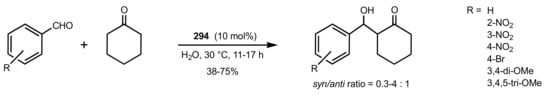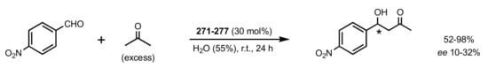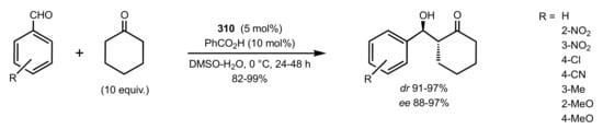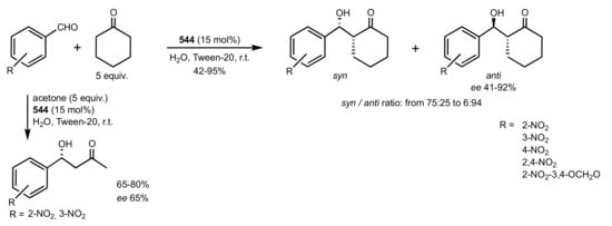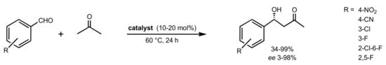 - Zhang, H.; Zhao, W.; Zou, J.; Liu, Y.; Li, R.; Cui, Y. Aldol Reaction Catalyzed by a Hydrophilic Catalyst in Aqueous Micelle as an Enzyme Mimic System. Chirality 2009, 21, 492–496. [Google Scholar] [CrossRef]