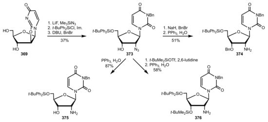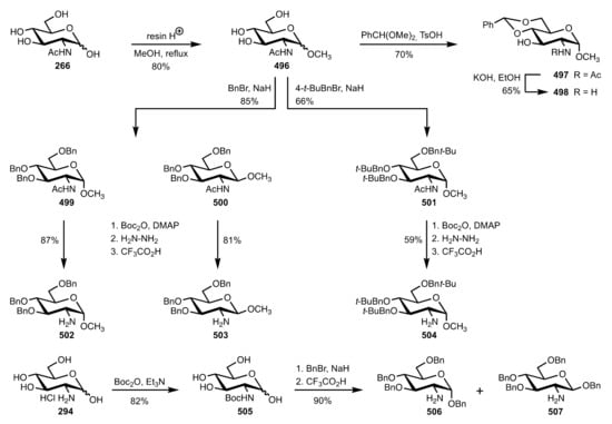 Novel bifunctional organocatalysts 58–62 bearing a tertiary amino group and a urea moiety were prepared by Benaglia, Lay, and their co-workers (Scheme 14) [45]. They were all obtained from a common starting material, the known glycosyl azide 54 (for its synthesis from commercially available d-glucosamine hydrochloride see Scheme 117 in Section 5.8). This compound was first deacetylated and then methylated, silylated or converted into the 4,6-O-benzylidene derivative and then silylated to give 55, 56 or 57, respectively. The azide group of 54, 56 and 57 was transformed into the amine function, and the latter reacted with bis-trifluoromethyl-phenylisocyanate.