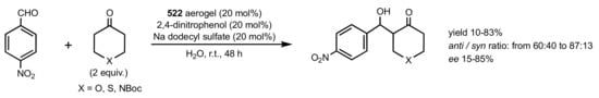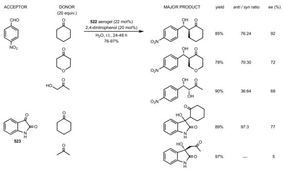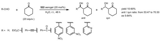 - Gioia, C.; Ricci, A.; Bernardi, L.; Bourahla, K.; Tanchoux, N.; Robitzer, M.; Quignard, F. Chitosan Aerogel Beads as a Heterogeneous Organocatalyst for the Asymmetric Aldol Reaction in the Presence of Water: An Assessment of the Effect of Additives. Eur. J. Org. Chem. 2013, 2013, 588–594. [Google Scholar] [CrossRef]