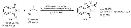 - Dong, H.; Liu, J.; Ma, L.; Ouyang, L. Chitosan Aerogel Catalyzed Asymmetric Aldol Reaction in Water: Highly Enantioselective Construction of 3-Substituted-3-hydroxy-2-oxindoles. Catalyst 2016, 6, 186. [Google Scholar] [CrossRef] [Green Version]