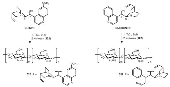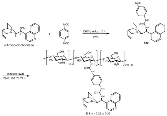 - Qin, Y.; Zhao, W.; Yang, L.; Zhang, X.; Cui, Y. Chitosan-Based Heterogeneous Catalysts for Enantioselective Michael Reaction. Chirality 2012, 24, 640–645. [Google Scholar] [CrossRef]