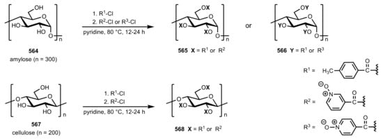 - Ikai, T.; Moro, M.; Maeda, K.; Kanoh, S. Synthesis of polysaccharide derivatives bearing pyridine N-oxide groups and their use as asymmetric organocatalysts. Eur. React. Funct. Polym. 2011, 71, 1055–1058. [Google Scholar] [CrossRef]