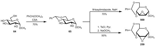 - Hicks, D.R.; Fraser-Reid, B. Selective sulphonylation with N-Tosylimidazole. A one-Step Preparation of Methyl 2,3-Anhydro-4,6-O-benzylidene-α-d-mannopyranoside. Synthesis 1974, 1974, 203–204. [Google Scholar] [CrossRef]