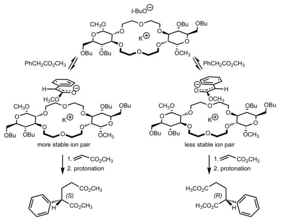 - Cram, D.; Sogah, G.D.Y. Chiral crown complexes catalyse Michael addition reactions to give adducts in high optical yields. J. Chem. Soc. Chem. Commun. 1981, 1981, 625–628. [Google Scholar] [CrossRef]