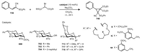 - Nemcsok, T.; Rapi, Z.; Bagi, P.; Guan, Y.H.; Orbán, I.; Keglevich, G.; Bakó, P. Enantioselective cyclopropanation of conjugated cyanosulfones using carbohydrate-based crown ether catalysts. Tetrahedron 2020, 76, 130965. [Google Scholar] [CrossRef]