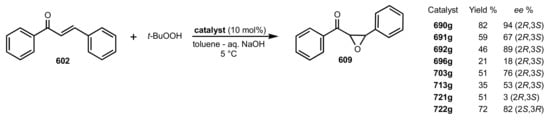 - Bakó, P.; Bakó, T.; Mészáros, A.; Keglevich, G.; Szöllősy, Á.; Bodor, S.; Makó, A.; Tőke, L. Phase Transfer Catalysed Asymmetric Epoxidation of Chalcones Using Chiral Crown Ethers Derived from d-Glucose and d-Mannose. Synlett 2004, 4, 643–646. [Google Scholar] [CrossRef]