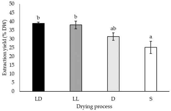 Global extraction yields in percentage of dry weight (% DW) obtained for ethanolic extraction of Agave lechuguilla bagasse freeze-dried in the dark (LD), exposed to light (LL), oven-dehydrated (D), and sun-dried (S). The given letters “a”, “b”, and “ab” indicate statistically significant results as per Kruskal–Wallis test (n = 3, p < 0.05).