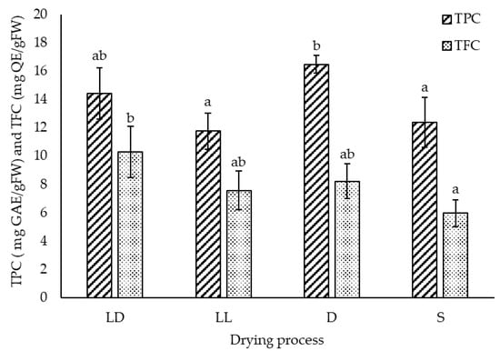 The total polyphenol content (TPC) expressed in milligram gallic acid equivalents (mg GAE) and total flavonoid content (TFC) in milligram quercetin equivalents (mg QE) per gram of fresh weight (FW) measured in ethanolic extracts of Agave lechuguilla bagasse freeze-dried in the dark (LD), exposed to light (LL), oven-dehydrated (D), and sun-dried (S). The given letters “a”, “b”, and “ab” indicate significant differences as per Tukey HSD analysis for TPC and TFC data, respectively (n = 12, p < 0.05).