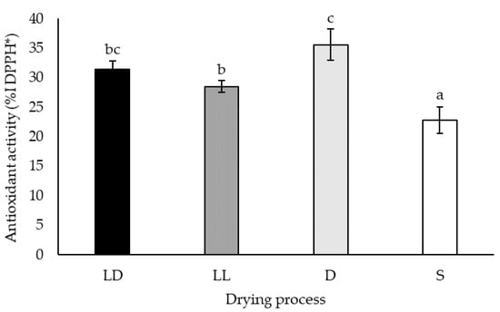 Antioxidant capacity of the ethanolic extracts of Agave lechuguilla bagasse freeze-dried in the dark (LD), exposed to light (LL), oven-dehydrated (D), and sun-dried (S) expressed as a percentage of the scavenging of the DPPH radicals (% I DPPH). The given letters “a”, “b”, “c”, and “bc” indicate significant differences as per Tukey HSD analysis (n = 4, p < 0.05).
