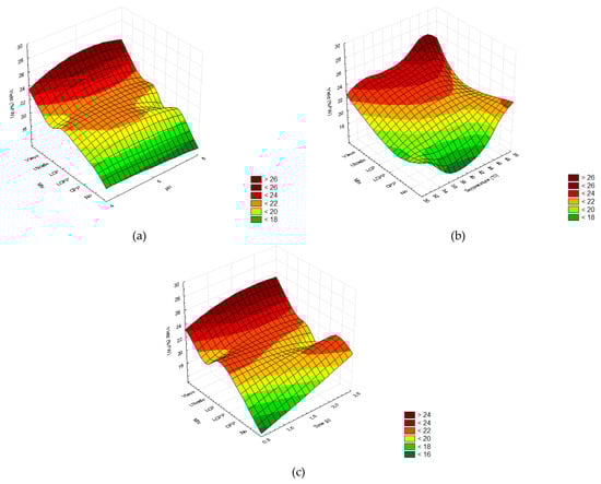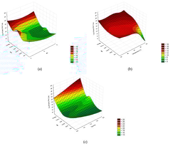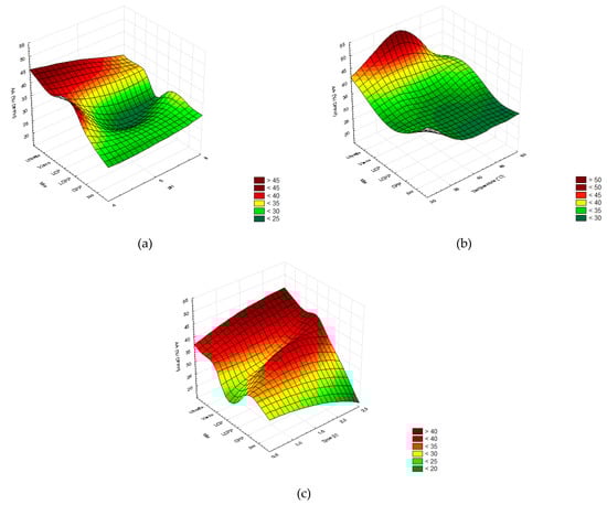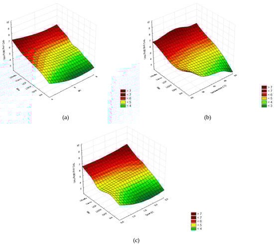 In addition to the enzyme ratio, the pH, temperature, and treatment time were evaluated in the second DOE because of their effect on enzymatic activity and phenolic compound retrieval. Optimal activity at pH 4, suggested in the first DOE (Figure A1 and Figure A2), was confirmed by the results of DOE II. Therefore, the highest yield (Figure 4a), TPC (Figure 5a), and TFC (Figure 6a) were obtained for pH 4 (Figure 4a, Figure 5a, and Figure 6a). Likewise, the total phenolic and flavonoid recovery were improved with incubation time (Figure 5c and Figure 6c), whereas the tested temperature range had no significant impact (Figure 5b and Figure 6b). The PCA confirmed this result (Figure 7), which concluded that enzyme mix composition was the main factor influencing the phenolic and flavonoid recovery from A. lechuguilla hydrolyzed bagasse.