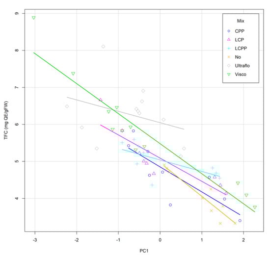 The total flavonoid content (mg QE/g FW) variability explained the 93.79% by the first principal component, PC1, related to the enzymatic cocktail (78.31%) and other factors level (21.69%). Lines represent linear regression of data dispersion within each enzymatic treatment. In order, two commercial cocktails: Ultraflo© (Ultraflo) and Viscozyme© (Visco); three formulated cocktails with laccase, cellulase, and pectinase at proportions of 1:1:1 (LCP), 1:1:2 (LCPP), and 0:1:2 (CPP); and the control without added enzymes (No).