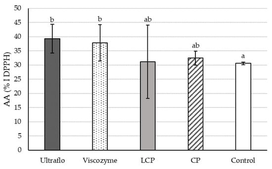The antioxidant activity (AA) of the ethanolic extracts of Agave lechuguilla bagasse estimated through a DPPH radical scavenging assay after enzymatic hydrolysis conducted with two commercial cocktails (Ultraflo© and Viscozyme©), two formulated cocktails with laccase, cellulase, and pectinase at proportions of 1:1:1 (LCP) and 0:1:2 (CP), and the control treatment without enzymes. Different letters indicates statistical significance with the Kruskal–Wallis test (n = 6, p < 0.05).