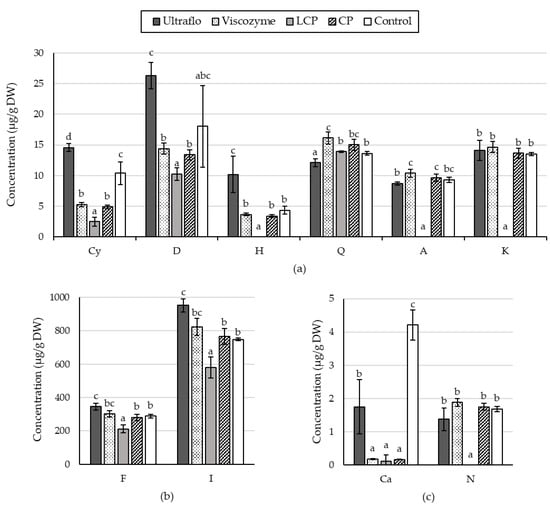 Furthermore, Viscozyme©, CP, and the control treatment had no significant differences, whereas the lowest values were from the LCP treatment (212.48 ± 22.95 and 581.11 ± 62.34 µg/g DW). Finally, in Figure 10c, the control treatment provided a better concentration of catechin (4.22 ± 0.45 µg/g DW), whereas the naringenin concentration did not differ from that of enzymatic treatment (1.68 ± 0.21 µg/g DW) except for with LCP where it was unquantifiable.