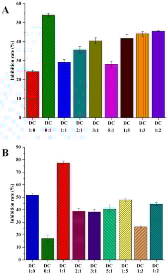 The % inhibition from DC extracts with different proportions of Danshen and Chuanxiong on thrombin (A) and factor Xa (B).