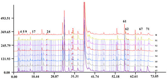 Aligned HPLC chromatograms of DC extracts with seven proportions of Danshen and Chuanxiong. The chromatograms of S1–S7 are as follows: DC 1:1 (S1); DC 1:2 (S2); DC 1:3 (S3); DC 1:5 (S4); DC 2:1 (S5); DC 3:1 (S6); DC 5:1 (S7); and control map (R).