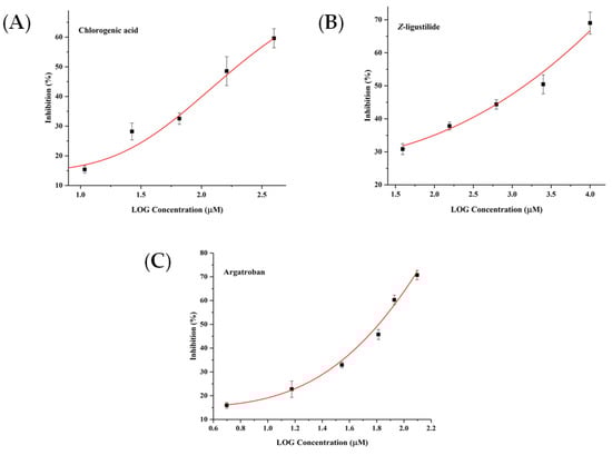 The inhibitory activity of chlorogenic acid (A), Z-ligustilide (B) and argatroban (C) on thrombin.