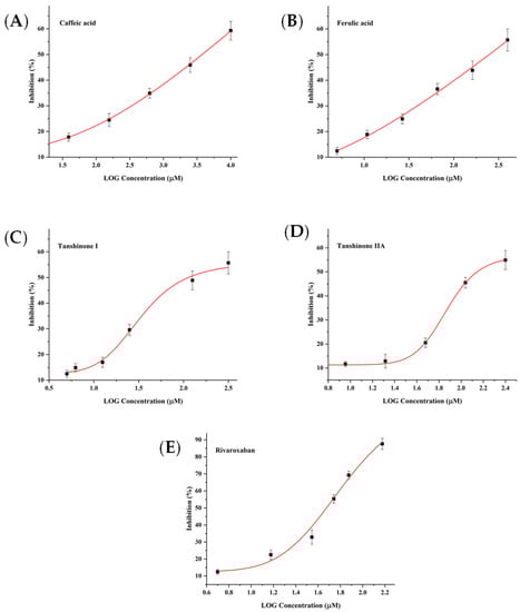 The inhibitory activity of caffeic acid (A), ferulic acid (B), tanshinone I (C), tanshinone IIA (D) and rivaroxaban (E) on FXa.
