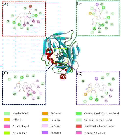Binding modes and interactions between caffeic acid (A), ferulic acid (B), tanshinone I (C), tanshinone IIA (D) and the factor Xa catalytic site.