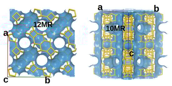 Schematic representation of the 12-membered and 10-membered channels of MSE-type zeolite. The figure is obtained frm the Animated Drawing of the MSE Framework, available on the IZA website (https://europe.iza-structure.org (accessed on 15 October 2021)).