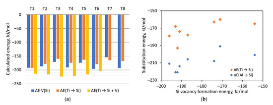 (a) Calculated energies for Si vacancy formation, the substitution of Si by Ti, and substitution of Si by Ti with simultaneous formation of neighboring Si vacancy (the most stable location of the vacancy was used). (b) Substitution energies for Si by Al or Si by Ti versus Si vacancy formation energy at the corresponding T-atom position.