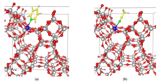 Adsorption complexes of pyridine (a) and acetonitrile (b) on Ti centers incorporated in position T1 of MSE type zeolite. Color coding: Si—gray, Ti—blue, O—red, N—green, C—yellow, H—white.