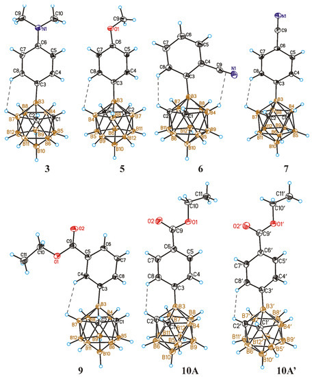 This prompted us to perform an X-ray diffraction study of the synthesized 3-aryl-ortho-carboranes. The solid-state structures of carboranes 3, 5–7, 9 and 10 were determined by single crystal X-ray diffraction (Figure 1). The most characteristic feature of the structure of 3-aryl-ortho-carboranes is the deviation of the exo-polyhedral B-C bond from the B(3)-B(10) axis of the carborane cage towards the carborane C(1)-C(2) bond (See Table 1).