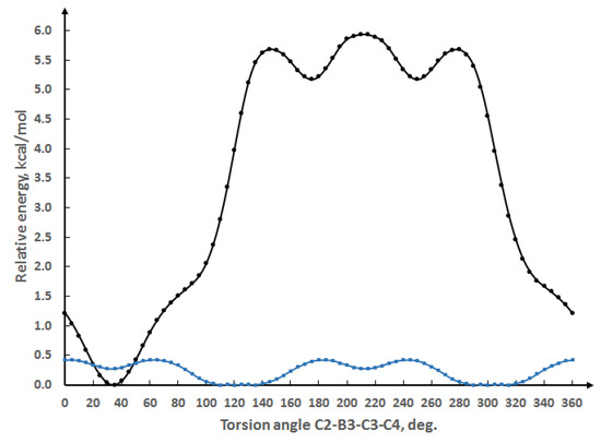 Dependence of conformational energy on C(2)-B(3)-C(3)-C(4) torsion angle for compounds 6 (black curve) and 7 (blue curve).