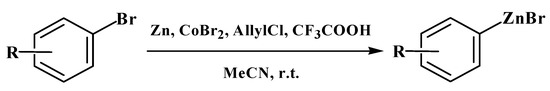 - Fillon, H.; Gosmini, C.; Périchon, J. New chemical synthesis of functionalized arylzinc compounds from aromatic or thienyl bromides under mild conditions using a simple cobalt catalyst and zinc dust. J. Am. Chem. Soc. 2003, 125, 3867–3870. [Google Scholar] [CrossRef] [PubMed]