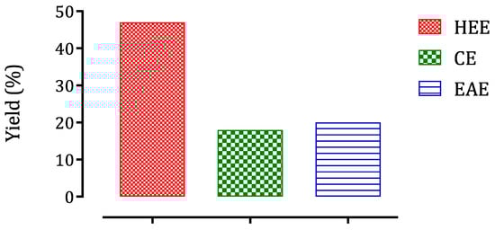 The yield of the hydroethanolic extract and the chloroform and ethyl acetate fractions. HEE—hydroethanolic extract; CE—chloroform extract; EAE—ethyl acetate extract.