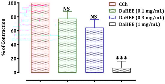 Effect of the DaHEE on rat jejunum precontracted by carbachol 10−6 M. NS: not significant; *** p ≤ 0.001 in comparison with the control. The values are the means ± SEM (n = 5). DaHEE—D. ambrosioides hydroethanolic extract; CCh—carbachol.