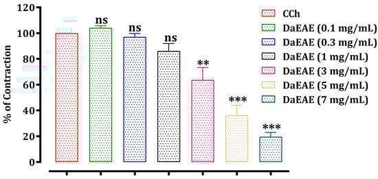 Effect of the DaEAE on rat jejunum precontracted by carbachol 10−6 M. ns: not significant; ** p ≤ 0.01 and *** p ≤ 0.001 in comparison with the control. The values are the means ± SEM (n = 5). DaEAE—D. ambrosioides ethyl acetate extract; CCh—carbachol.
