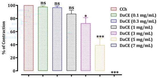 Effect of the DaCE on rat jejunum precontracted by carbachol 10−6 M. ns: not significant; * p ≤ 0.05 and *** p ≤ 0.001 compared to the control. The values are the means ± SEM (n = 4). DaCE—D. ambrosioides chloroform extract; CCh—carbachol.