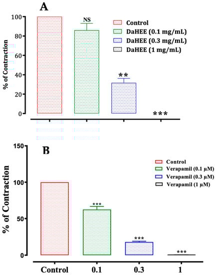 Myorelaxant effect of DaHEE flowers(A) and verapamil (B) and the on spontaneous contractions of the rabbit jejunum. NS: not significant; ** p ≤ 0.01 and *** p ≤ 0.001 compared to the control. The values are the means ± SEM (n = 6). DaHEE—D. ambrosoidese hydroethanolic extract.