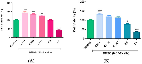 The effect of dimethyl sulfoxide (DMSO) on cell viability. An overview of the cytotoxicity effects of DMSO on the (A) H9c2 cardiomyoblasts and (B) MCF-7 breast cancer cells. Briefly, H9c2 and MCF-7 cells were treated with varying DMSO concentrations (0.001, 0.009, 0.067, 0.5, and 3.7%) every second day for 6 days. Untreated cells served as the control. Data are presented as the mean ± SEM of 3 biological experiments with 5 technical repeats (n = 3). Significance is indicated as # p < 0.05, ## p < 0.01, and ### p < 0.001 versus the control.