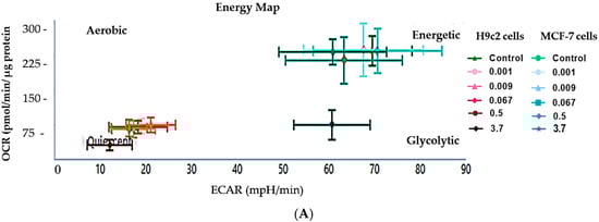 Respiratory parameters associated with mitochondrial bioenergetics were measured in intact breast cancer cells and cardiomyoblasts using the XF Cell Mito Stress Kit (Seahorse Bioscience, Billerica, MA, USA) according to the manufacturer’s instruction, which is based on the sequential injection of oligomycin, carbonyl cyanide-4-(trifluoromethoxy) phenylhydrazone, rotenone, and antimycin, as per the manufacturer’s instructions. Seeding densities for the H9c2 (1 × 104/well) and MCF-7 (5 × 103/well) cells were determined from a previous study [25]. Concisely, cells were seeded into XF96-well cell culture microplates (Seahorse Bioscience, Billerica, MA, USA) after which, treatment was initiated after 48 h as described above. In preparation of the assay, the cells were incubated for 1 h with the Seahorse base assay medium (supplemented with 2 mM glutamine, 10 mM glucose, and 1 mM pyruvate). Hereafter, mitochondrial oxygen consumption rate (OCR) and extracellular acidification rate (ECAR) were quantified on the intact live cells using the Seahorse XF96 extracellular flux analyser (Seahorse Bioscience, Billerica, MA, USA). The data were normalized to protein concentrations using the Bio-Rad DC Protein assay (Bio-Rad, Hercules, CA, USA), as per the manufacturer’s instructions with the resultant absorbance read at 695 nm using the SpectraMax® i3x Multi-Mode Microplate Reader. The results were expressed as pmol/min/mg protein for the OCR, and mpH/min/mg protein for the ECAR.