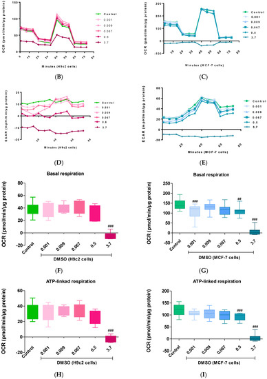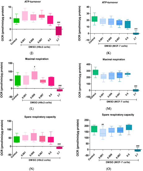 The effect of dimethyl sulfoxide (DMSO) on the mitochondrial bioenergetics in H9c2 cardiomyoblasts and MCF-7 breast cancer cells. (A) Energy phenotype, (B,C) Oxygen consumption rate (OCR), (D,E) extracellular acidification rate (ECAR), (F,G) basal respiration, (H,I) ATP-linked respiration, (J,K) ATP turnover, (L,M) maximal respiration and, (N,O) spare respiratory capacity. Both cell lines were treated every second day for 6 days with varying DMSO concentrations (0.001, 0.009, 0.067, 0.5, and 3.7%). Data are presented as the mean ± SEM of 3 biological experiments with 8 technical repeats (n = 3). Significance is indicated as # p < 0.05, ## p < 0.01, and ### p < 0.001 versus the control.