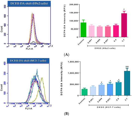 The effect of dimethyl sulfoxide (DMSO) on the production of reactive oxygen species (ROS) in (A) fluorescent shift of H9c2 cardiomyoblasts and (B) fluorescent shift of MCF-7 breast cancer cells. Cells were treated every second day for 6 days with varying DMSO concentrations (0.001, 0.009, 0.067, 0.5, and 3.7%). Data are presented as the mean ± SEM of 3 biological experiments with 3 technical repeats (n = 3). Significance is indicated as # p < 0.05, ### p < 0.001 versus the control.